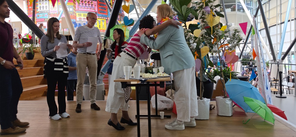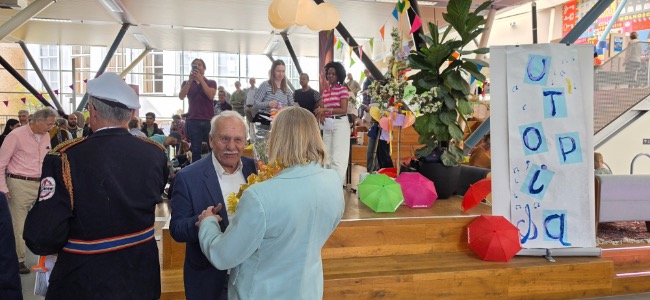 In de haven Paradiso wachtten kostelijke hapjes, bereid door cursisten. En een tweede verstekeling, Jan Hopman. Hij vertelde hoe Dianne een van de mensen was die bevlogen en enthousiast deelnam in het Welkomstcomité toen Syriërs in 2014 naar de Koepel in Breda kwamen. ,,Toen is het idee van de paraplus ontstaan, tegen regen en kogels, het logo dat Welkomsttaal nu kenmerkt. Je was niet altijd gemakkelijk, maar was deskundig en stelde de cursist altijd centraal.”
