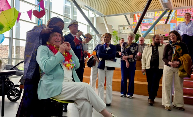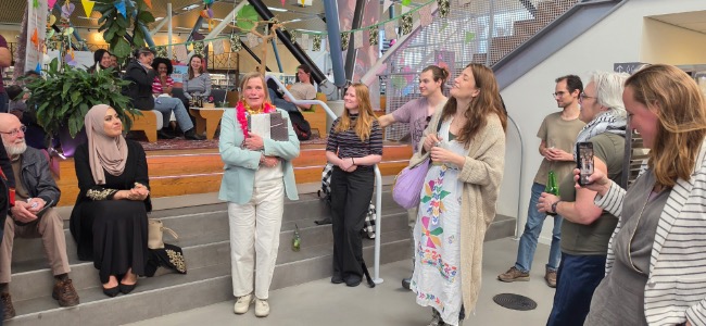 Met een ‘cruise’ namen cursisten en coaches van Welkomsttaal in De Nieuwe Veste massaal afscheid van oprichtster Dianne Kikstra. In de havens Utopia, El Dorado en Paradiso wachtten warme woorden. En verstekelingen, onder wie burgemeester Paul Depla. De blos op haar wangen werd steeds roder. ‘Fantastisch’.