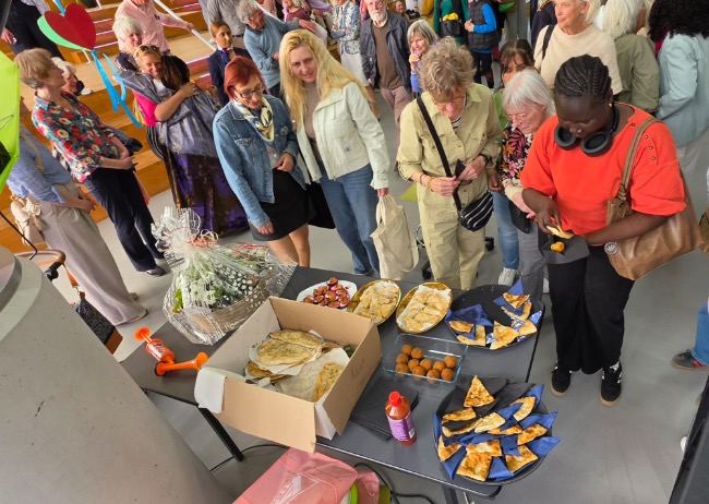 Adama verscheen in een prachtige jurk die bewijst hoe rijk klederdracht in andere culturen kan zijn. Als kapster vond zij dat het kapsel van Dianne wat aandacht vroeg. Een zwarte pruik leidde tot bewonderend applaus en welwillend gelach, ook van Dianne. De vele heerlijke hapjes van onder anderen Humaira en Christin vonden gretig aftrek, terwijl zij uitleg gaven over de producten uit hun eigen keuken.